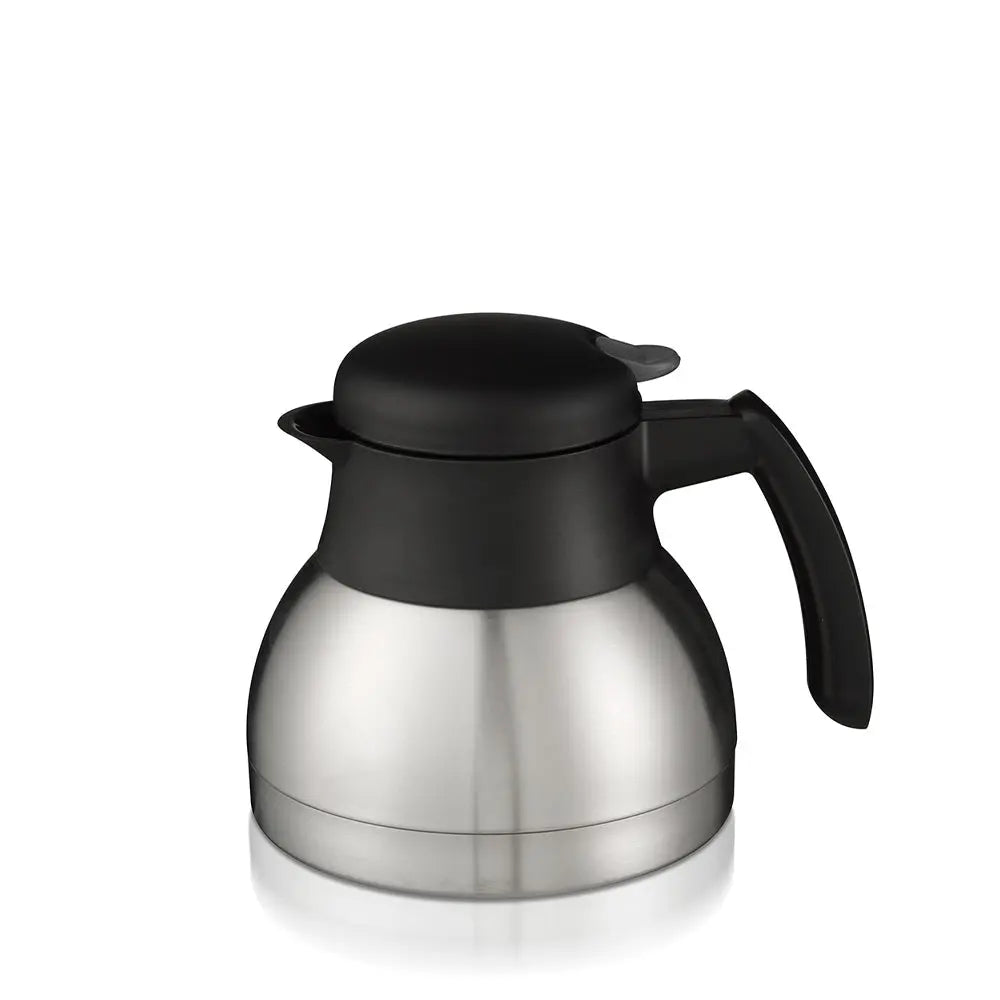 Roestvrijstalen dubbelwandige thermoskan van Bravilor, geïsoleerd, met draaideksel en voorzien van handige schenkclip.